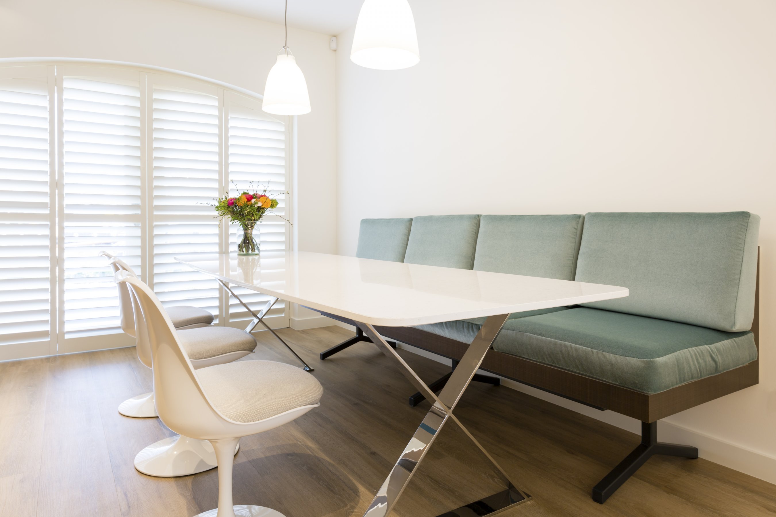 Het gehele interieur is een geweldige combinatie van strakke meubels die veel warmte uitstralen.
