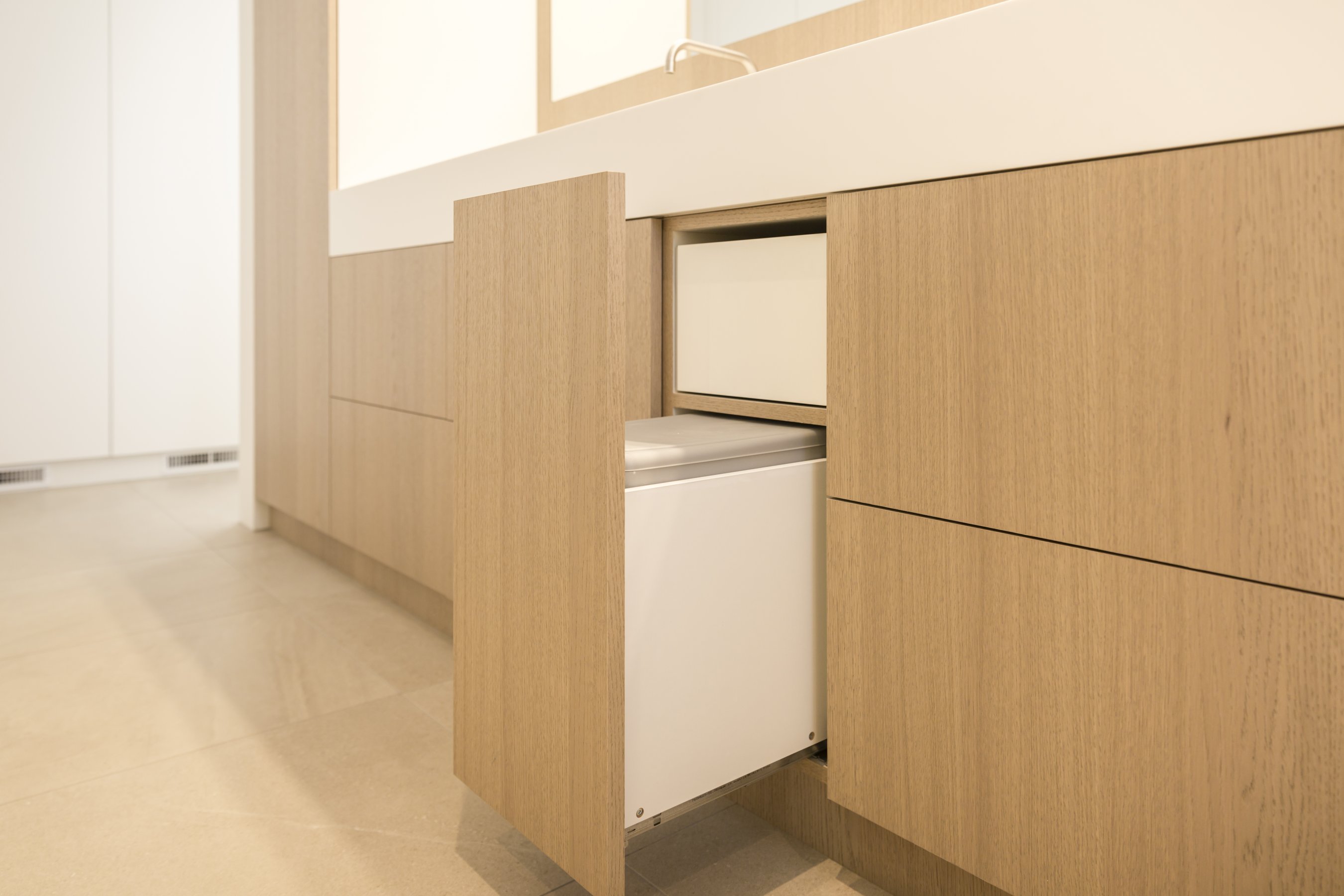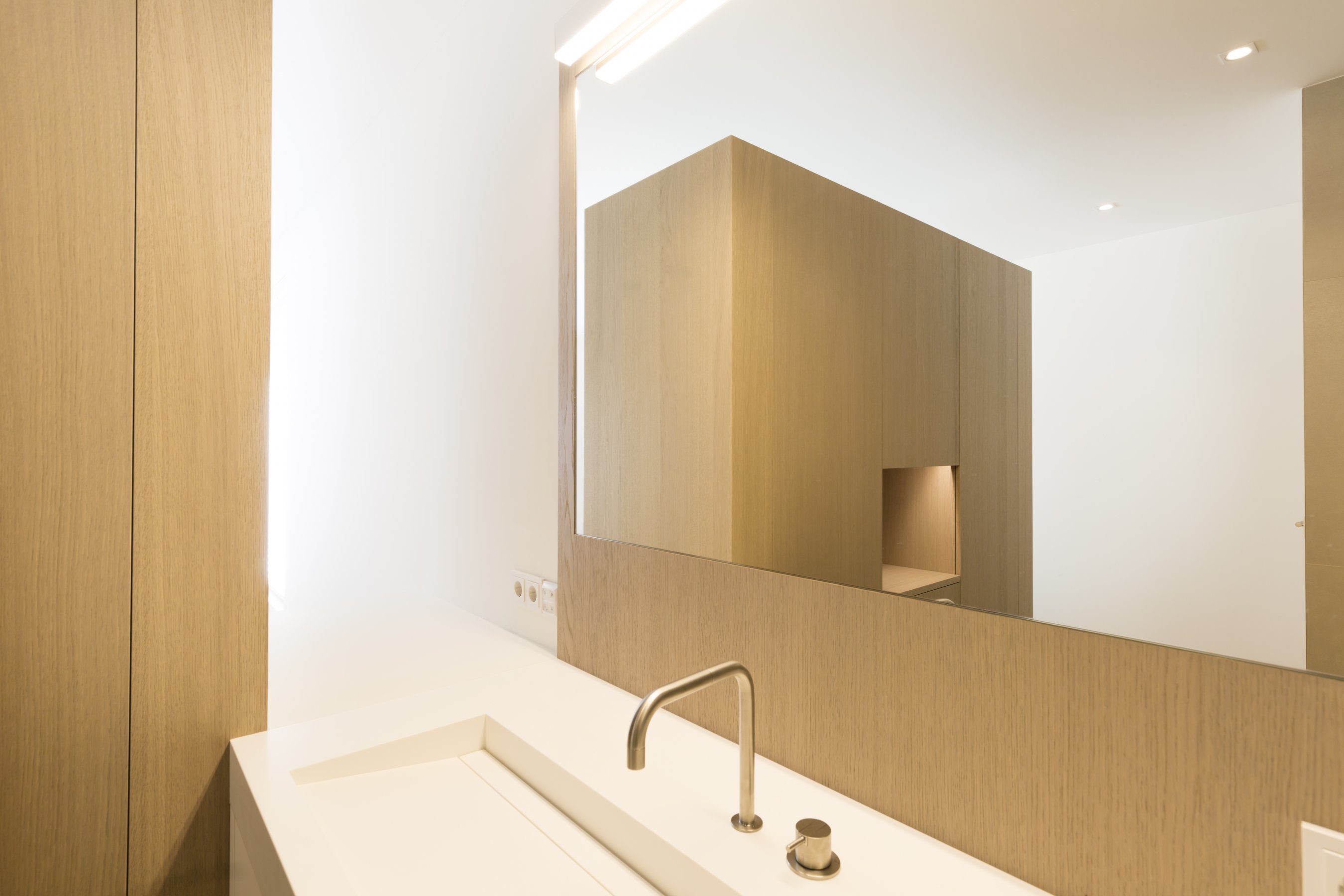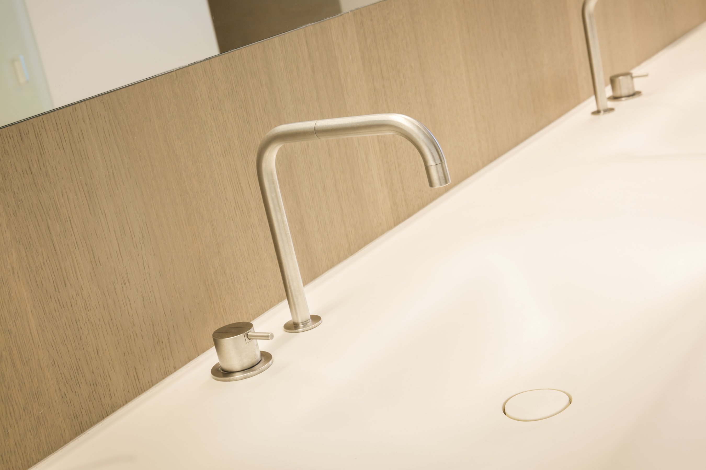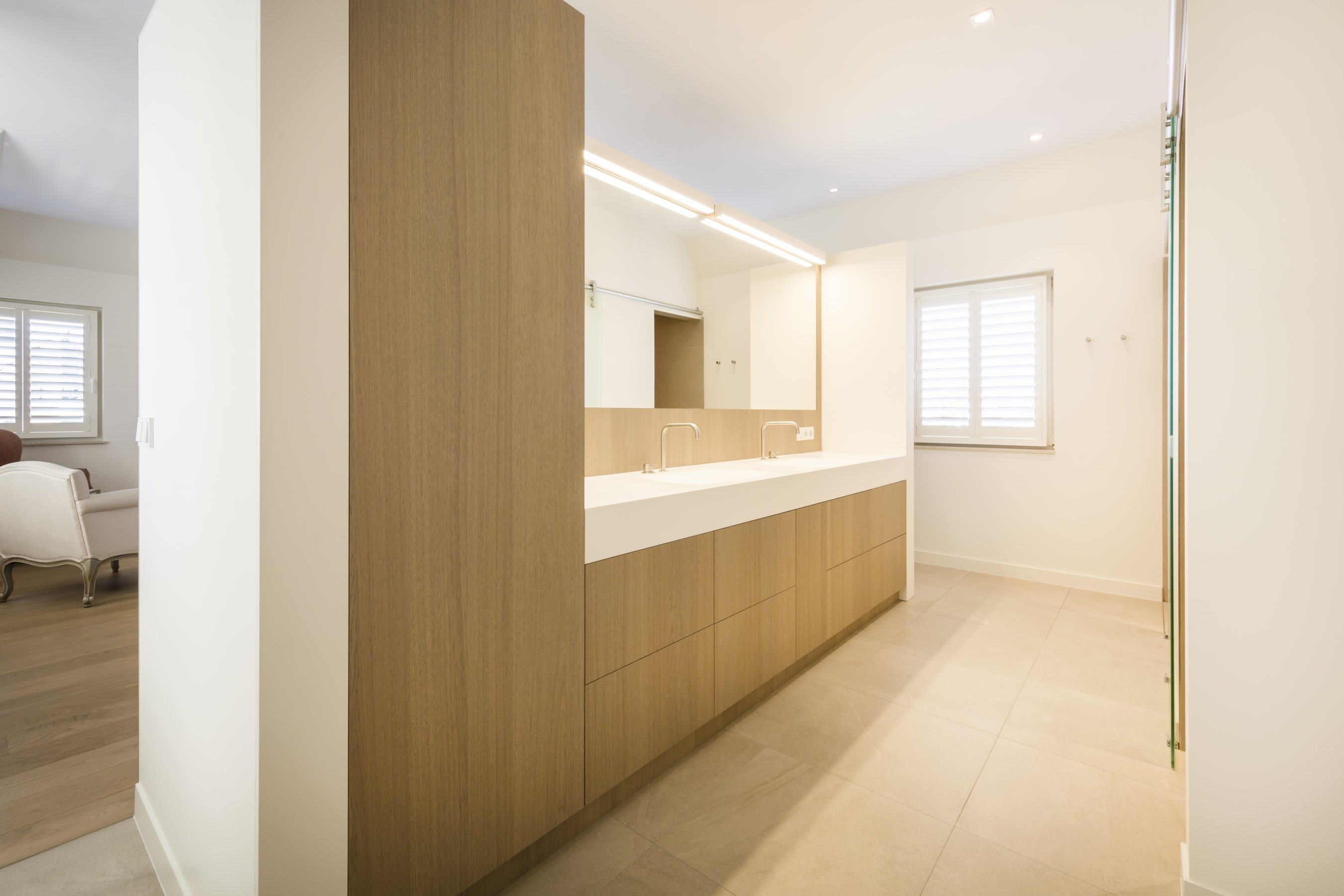 Om hetzelfde gevoel te creëren zijn er daarom overal dezelfde materialen gebruikt. Alle wastafelbladen zijn gemaakt van hi-macs, de wastafelmeubels zijn gemaakt van eiken fineer met de kleur dessert oak. De grote slaapkamer bestaat volledig uit greeploze kasten die gemaakt zijn van HPL met witte coating. Bijna alle wanden zijn voorzien van deze greeploze kasten. In het woongedeelte zijn de kastenwand en bank gemaakt van een speciaal soort geborsteld koper. De trap is een mooi stuk vakwerk wat een lust is voor het oog, dit is gemaakt van massief eiken.