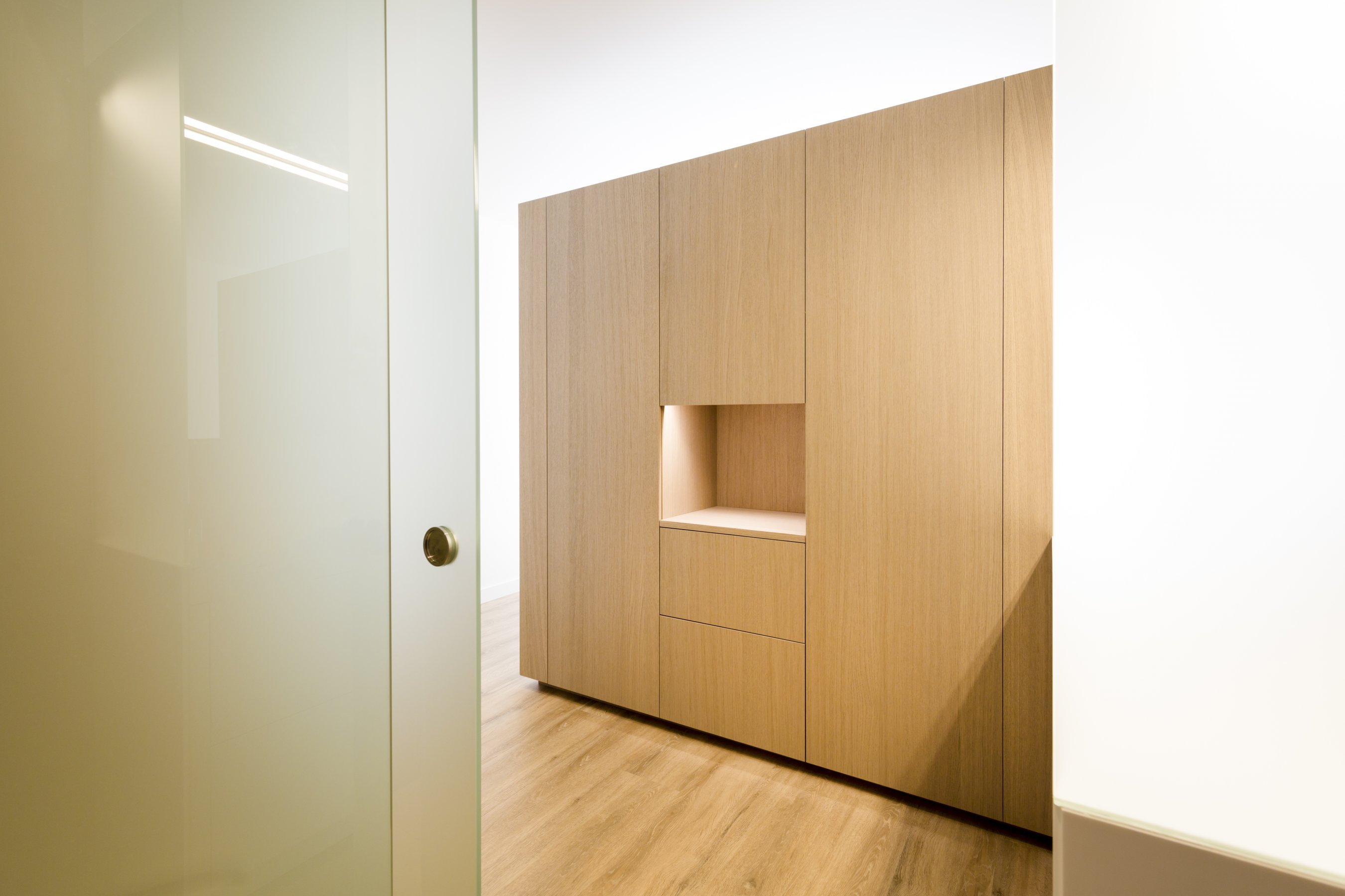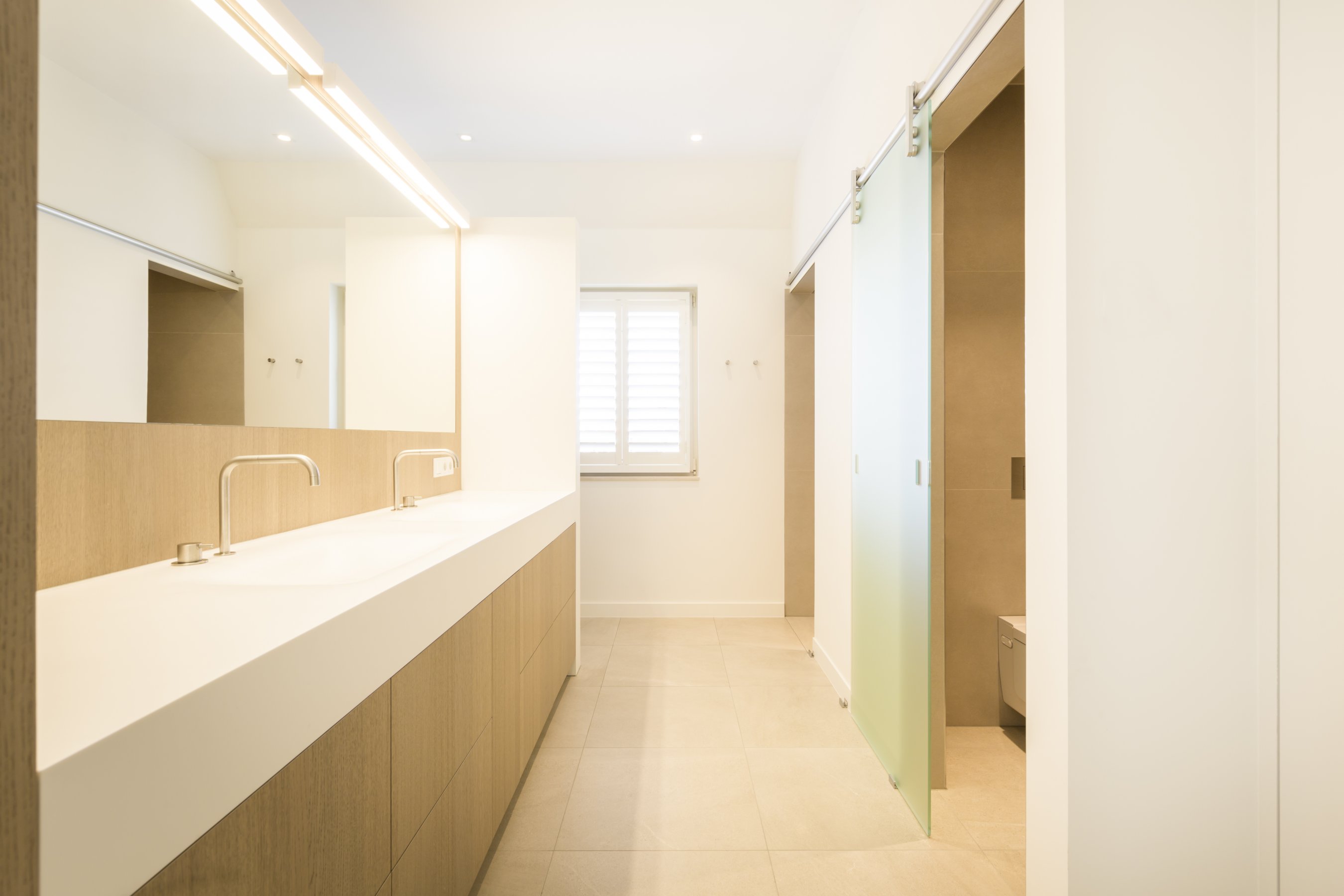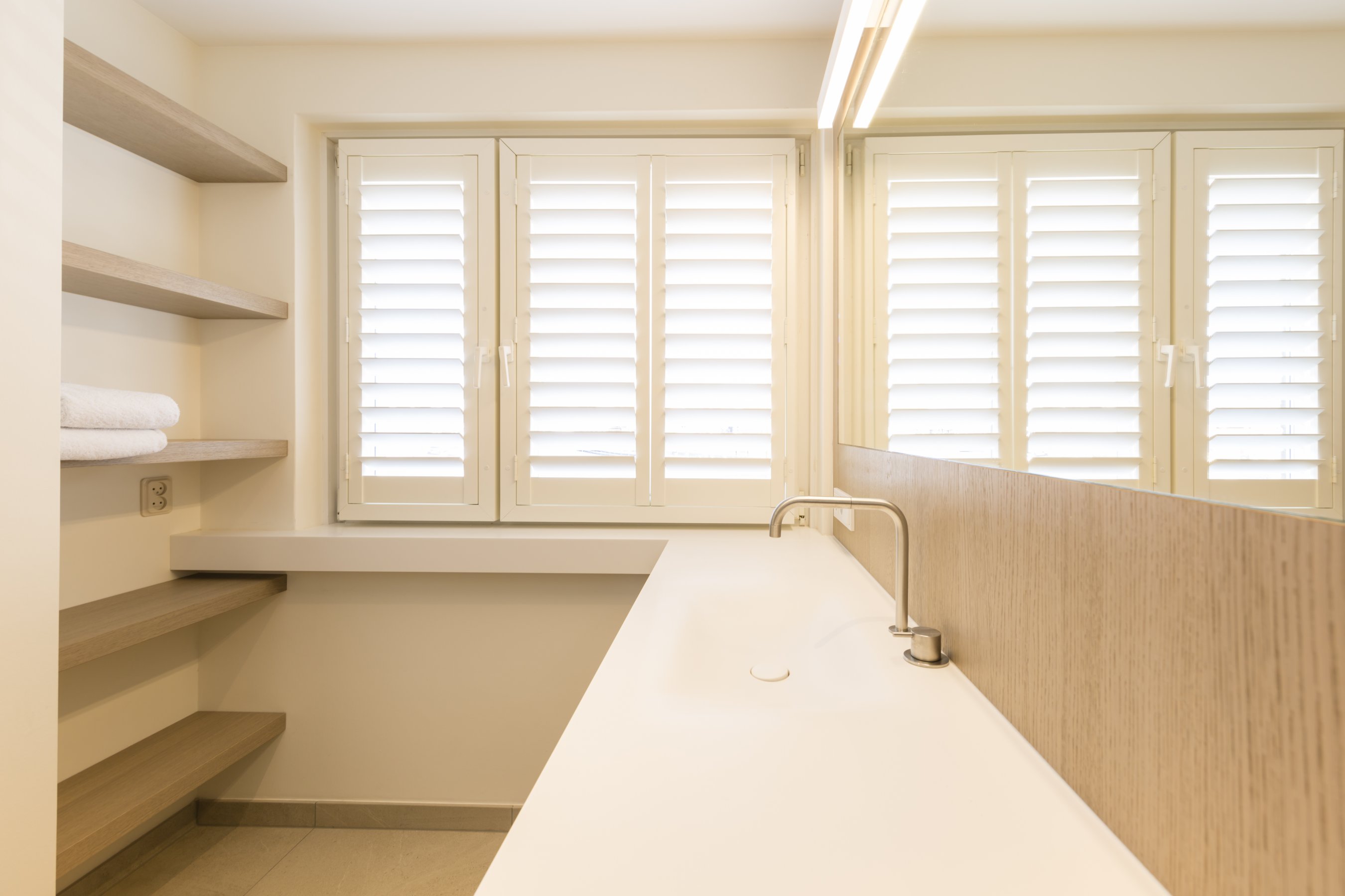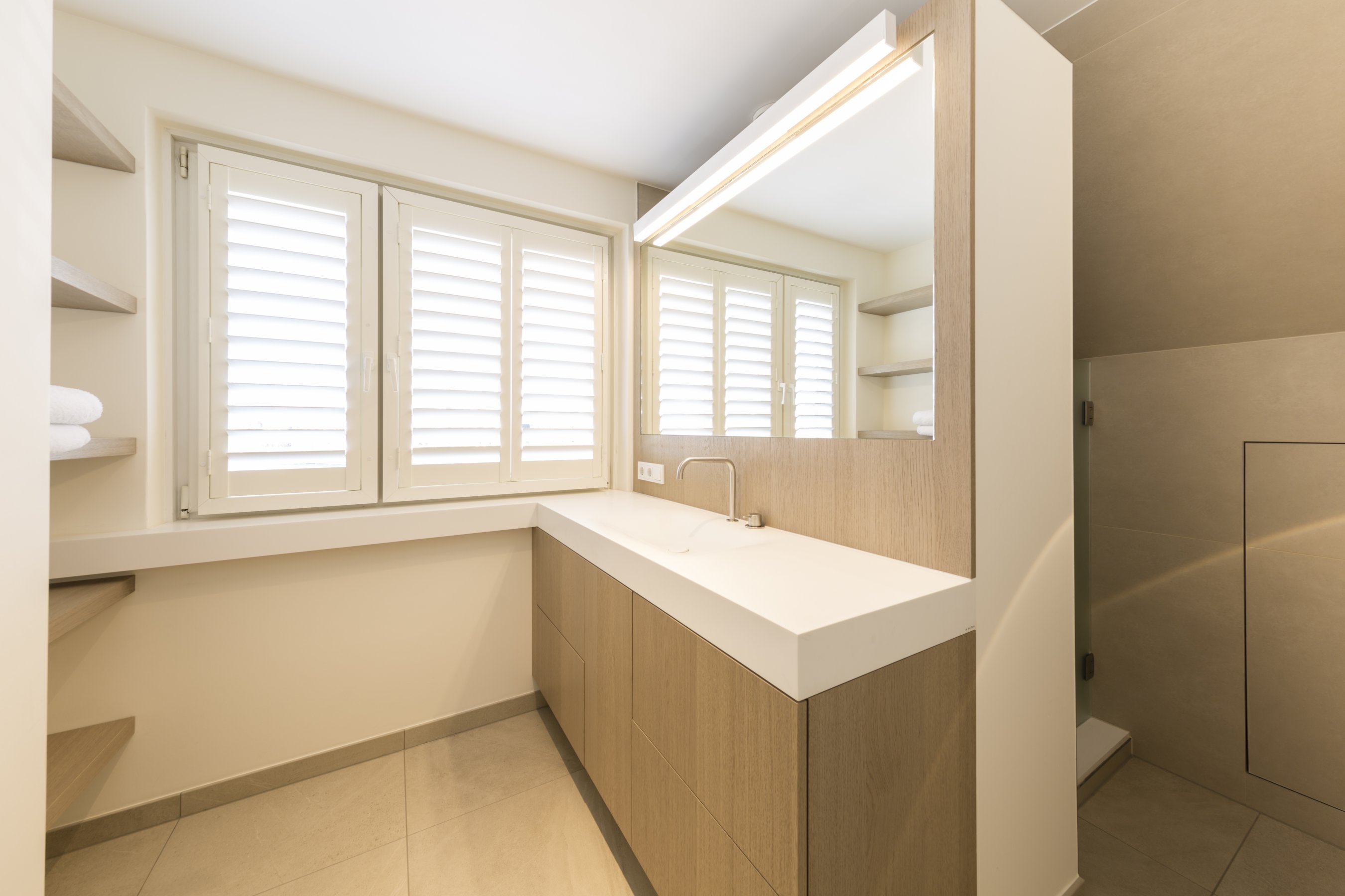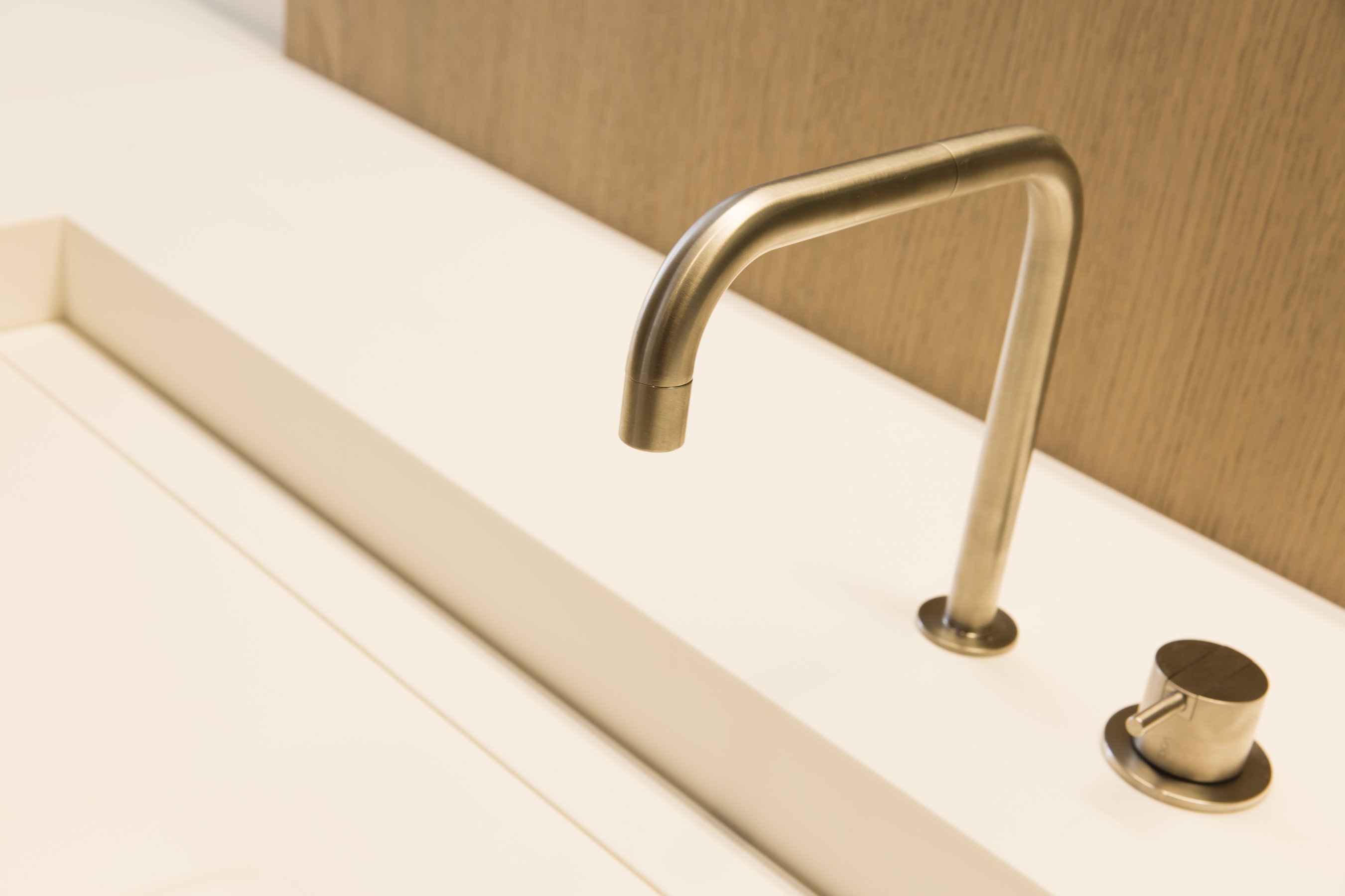 Om hetzelfde gevoel te creëren zijn er daarom overal dezelfde materialen gebruikt. Alle wastafelbladen zijn gemaakt van hi-macs, de wastafelmeubels zijn gemaakt van eiken fineer met de kleur dessert oak. De grote slaapkamer bestaat volledig uit greeploze kasten die gemaakt zijn van HPL met witte coating. Bijna alle wanden zijn voorzien van deze greeploze kasten. In het woongedeelte zijn de kastenwand en bank gemaakt van een speciaal soort geborsteld koper. De trap is een mooi stuk vakwerk wat een lust is voor het oog, dit is gemaakt van massief eiken.