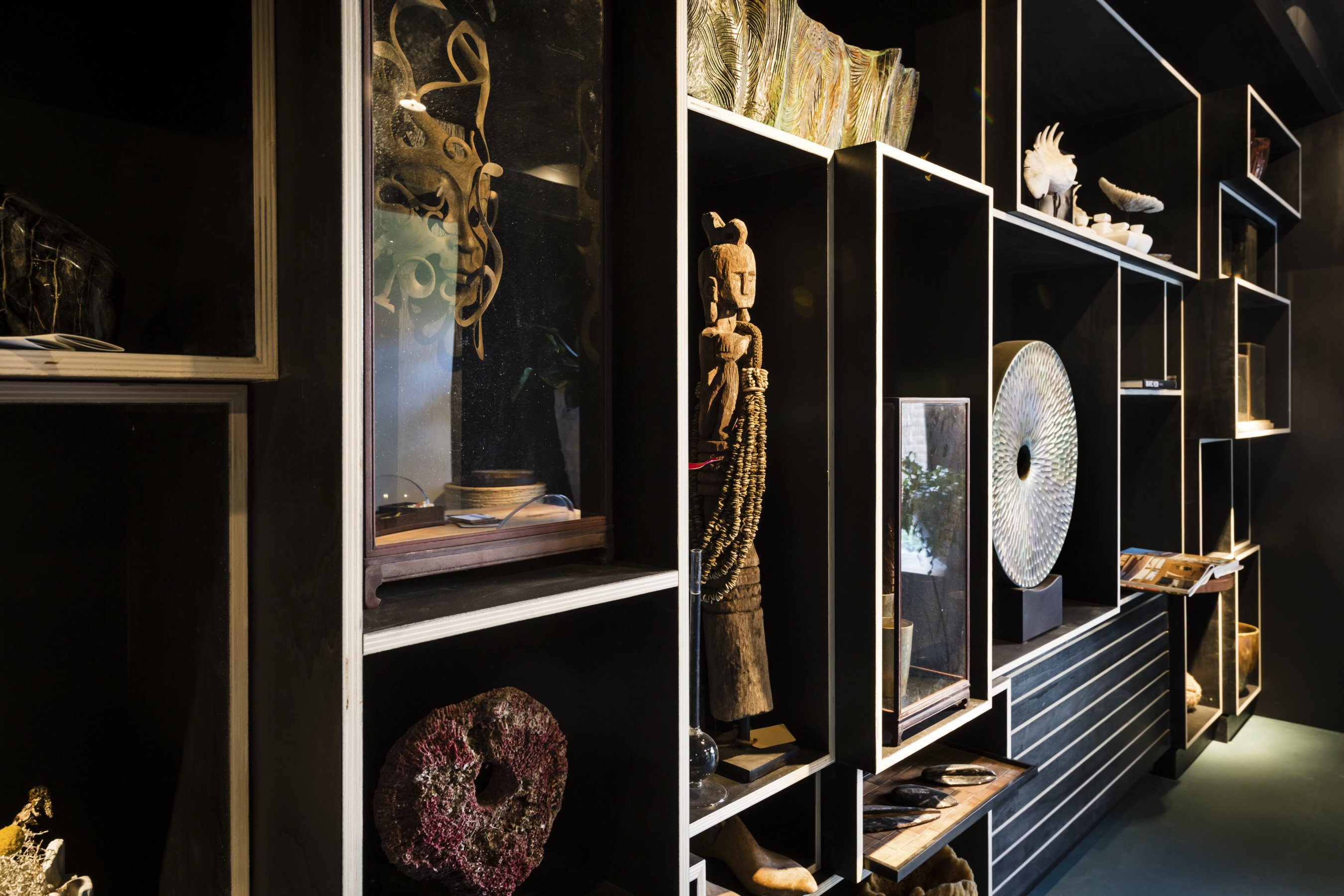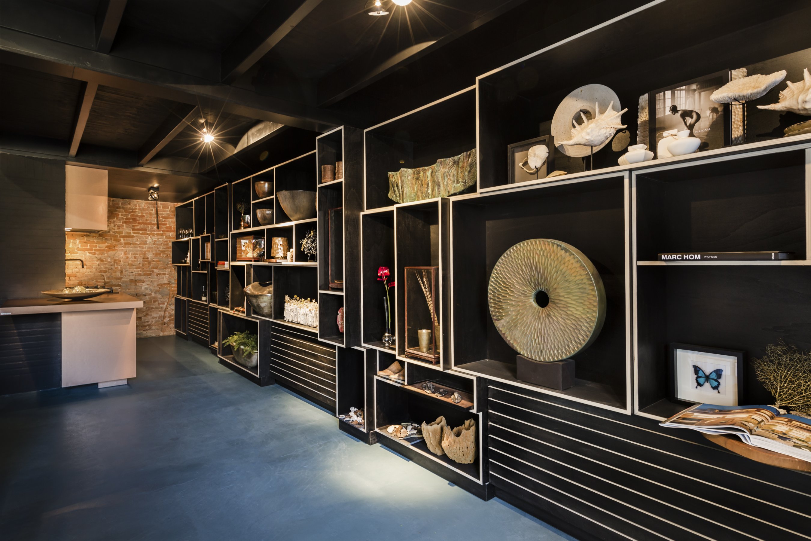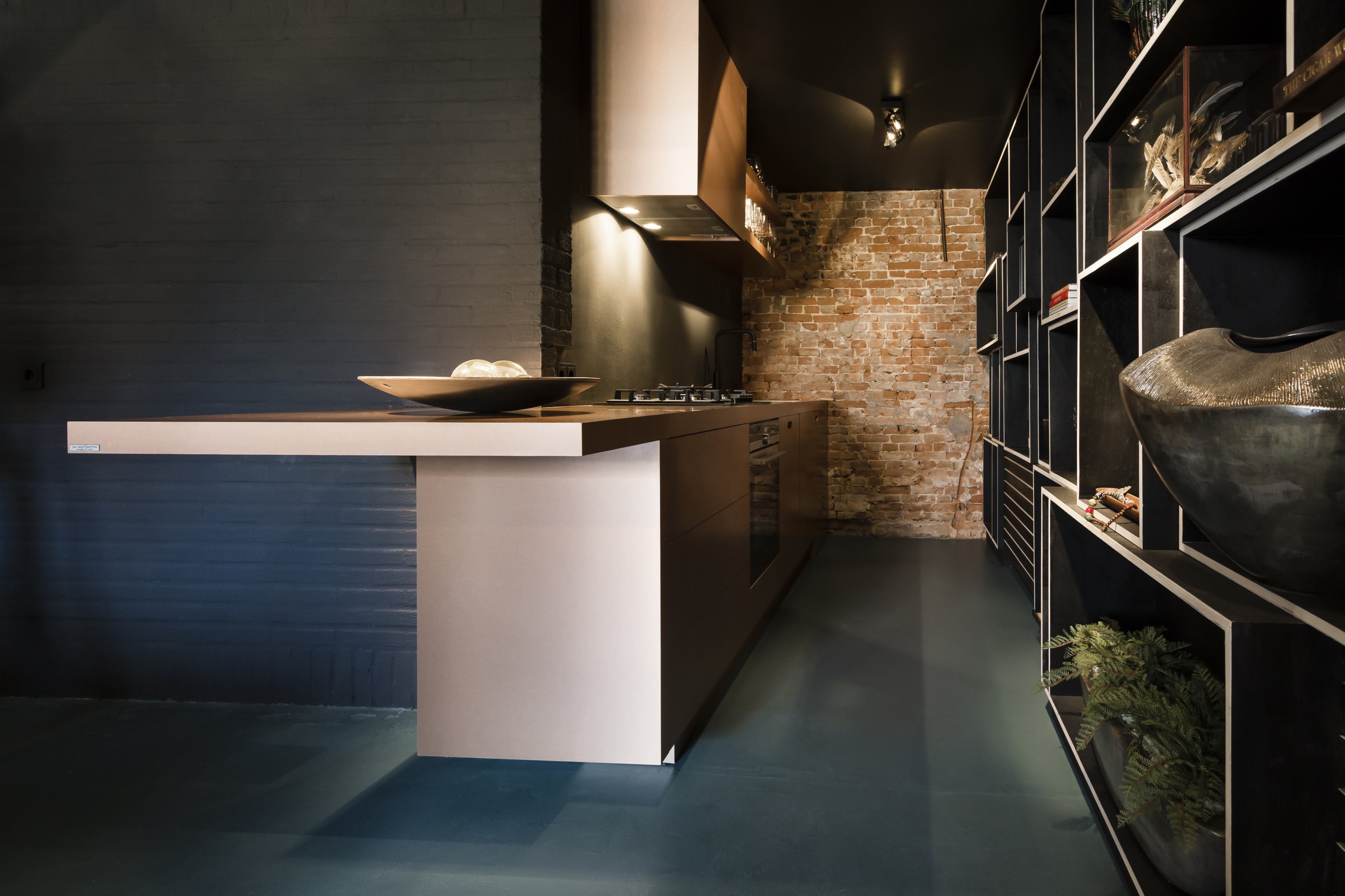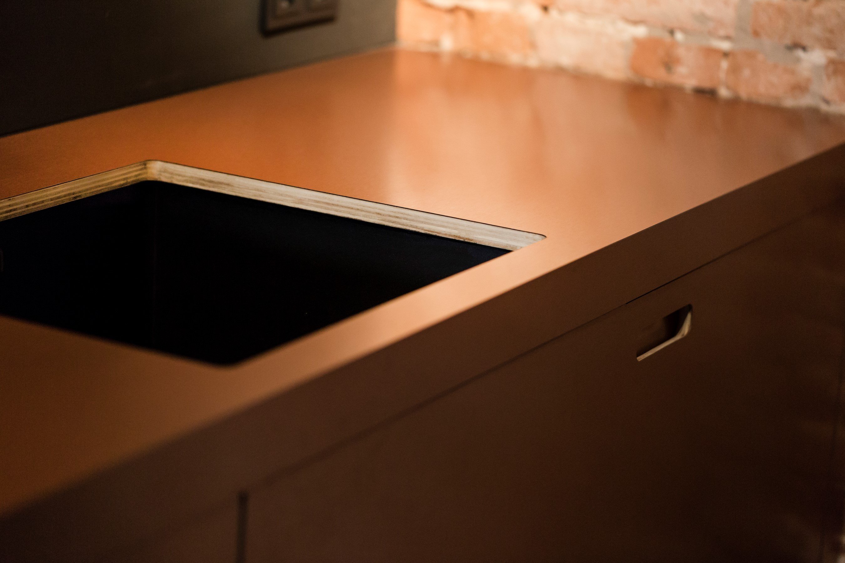 Een prachtige koperen keuken met een grote kastenwand. De kleine kastjes in verschillende afmetingen en het gebruik van reliëf geeft het geheel een mooi en ruimtelijk effect.