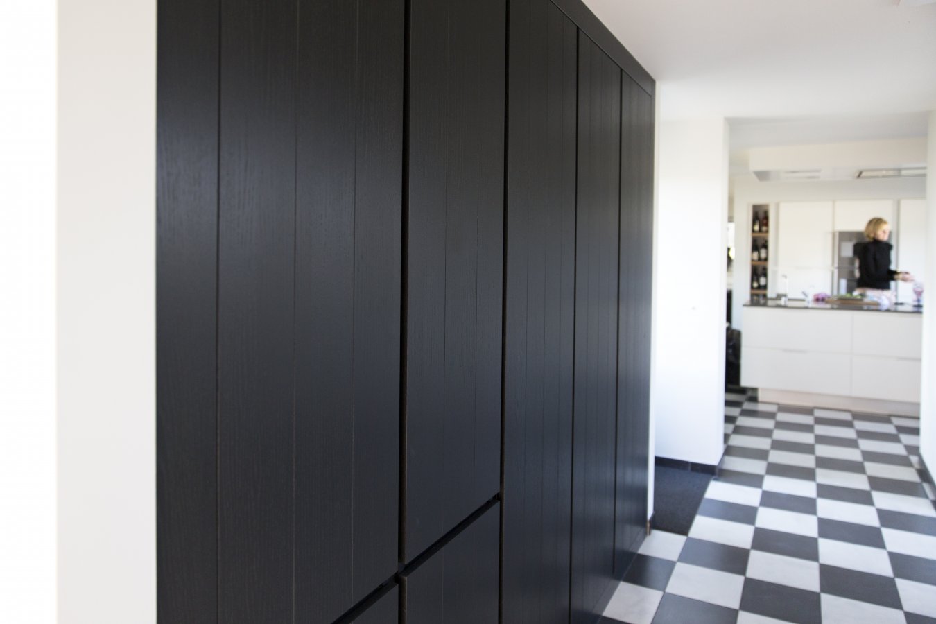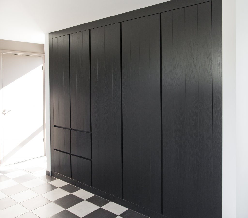 Omvangrijke op maat gemaakte inbouwkast met greeploze lades en deuren.