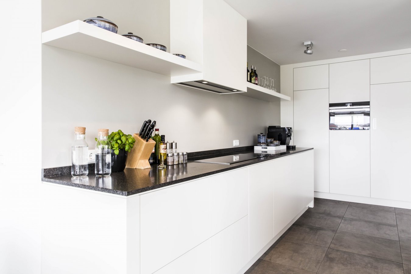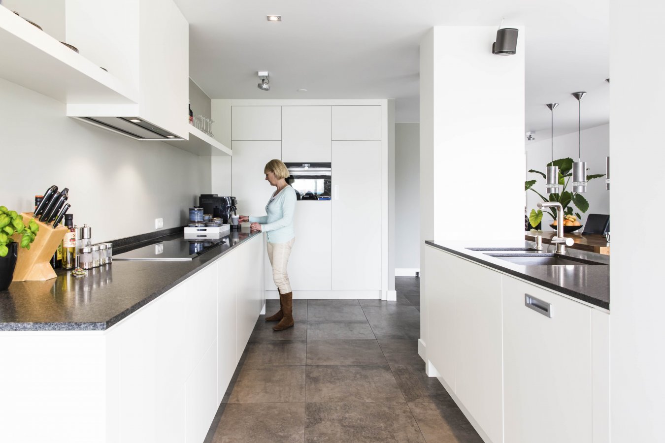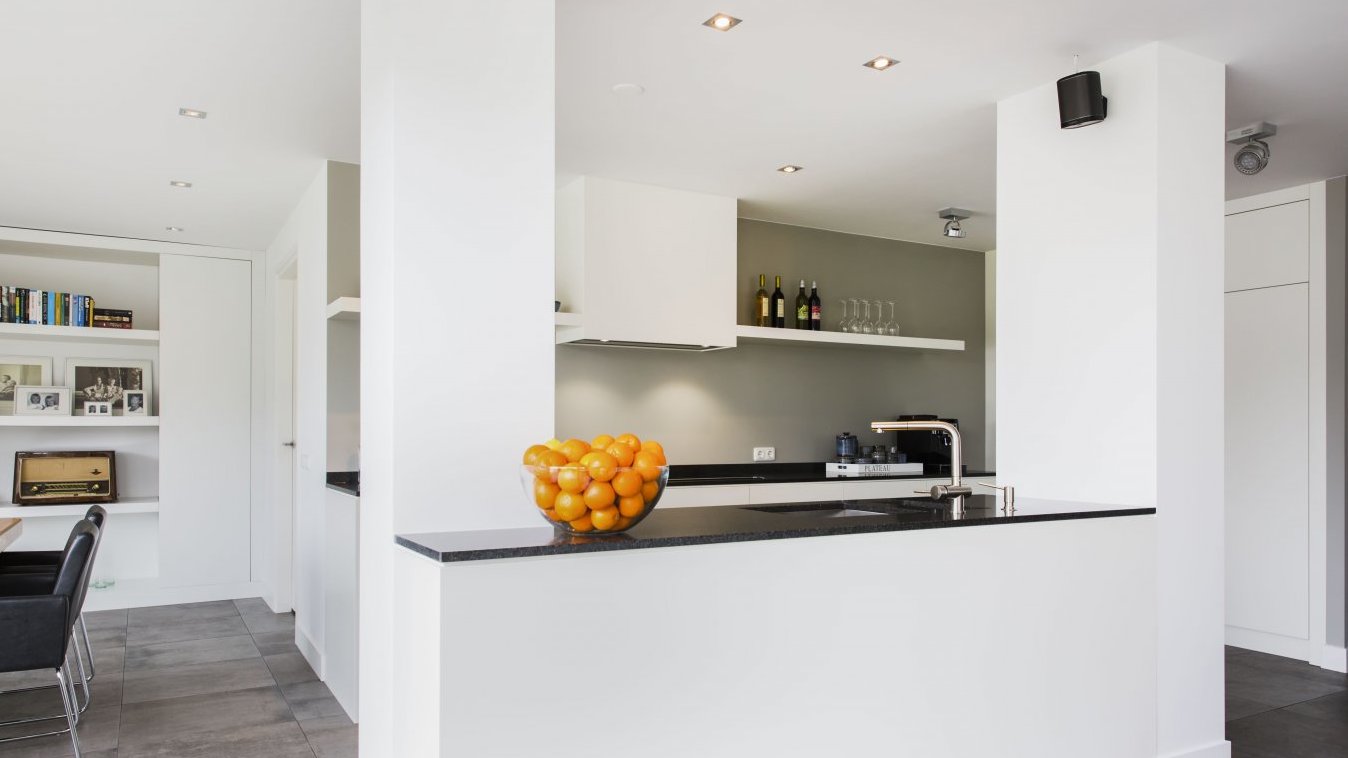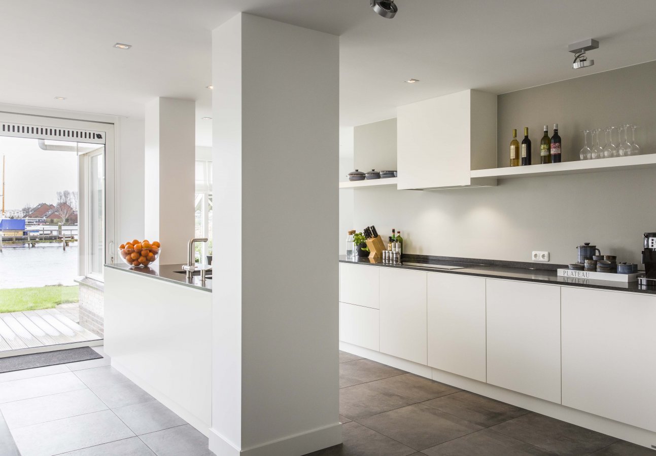 Ruim opgezette woonkeuken met voornamelijk witte kleuren in combinatie met het donkere keukenblad.