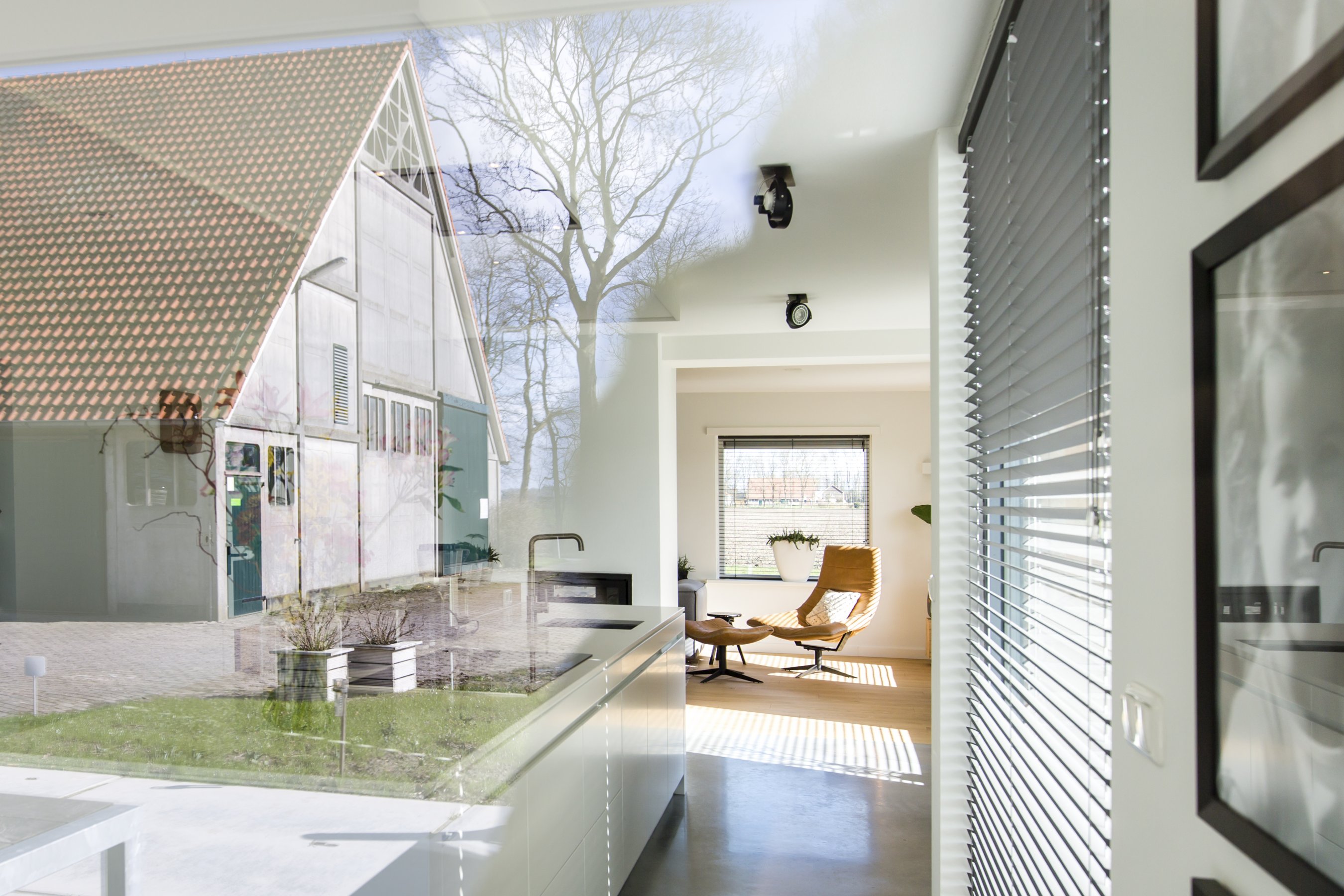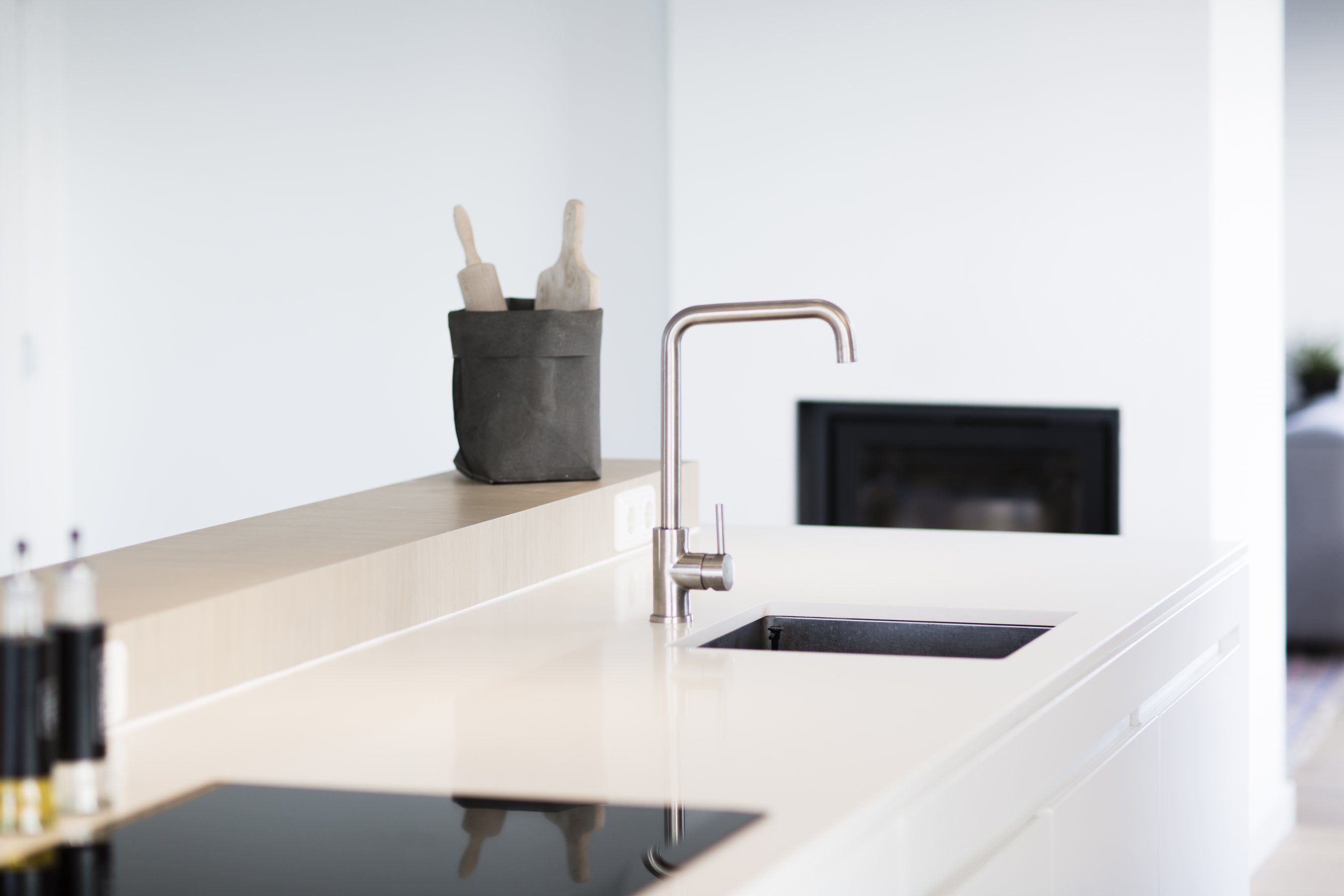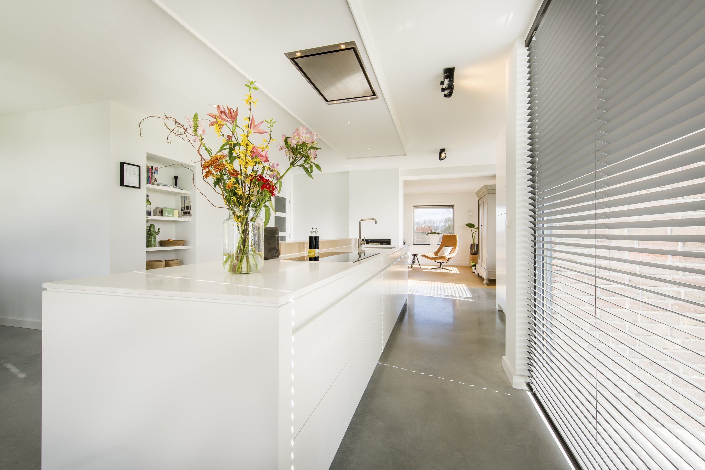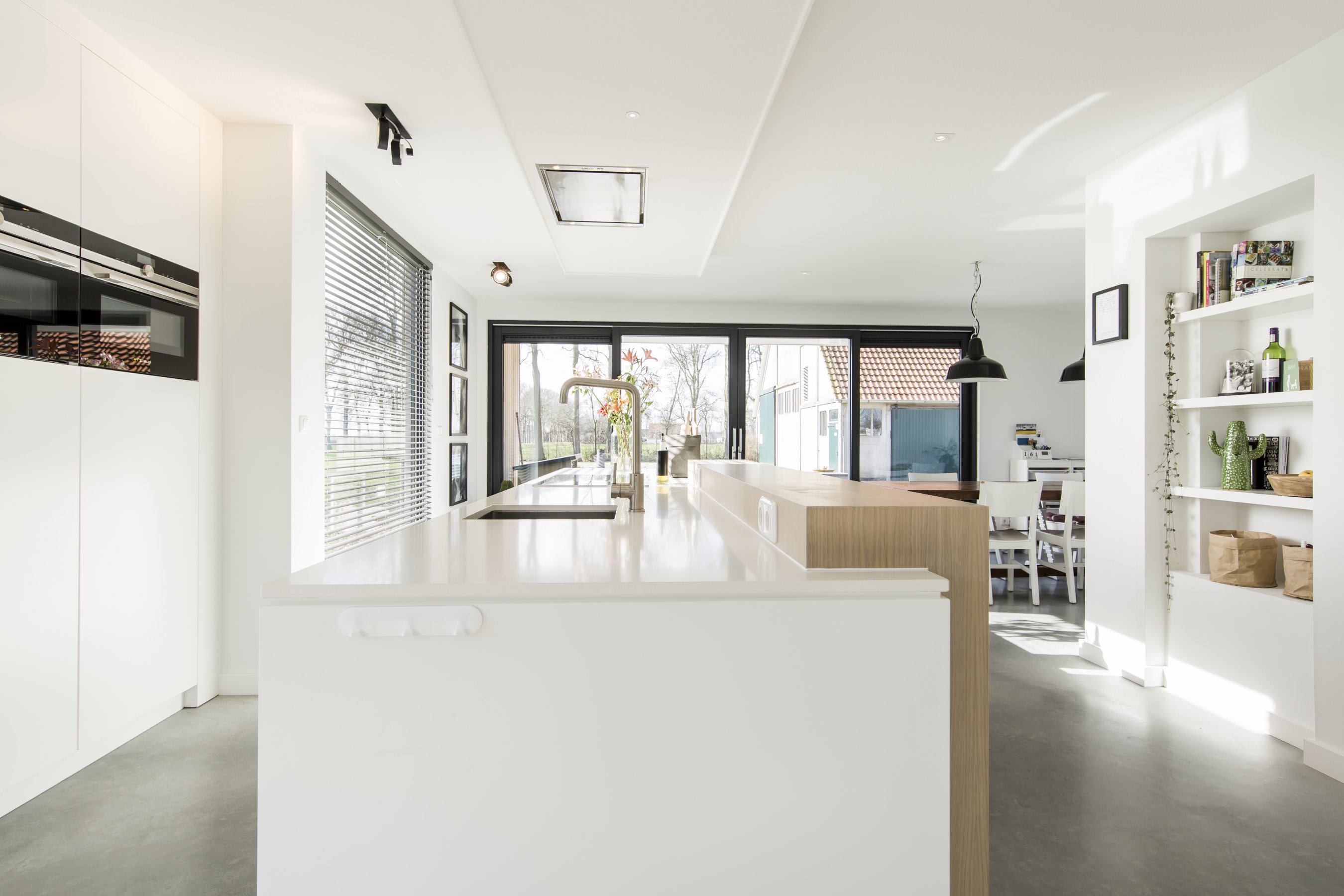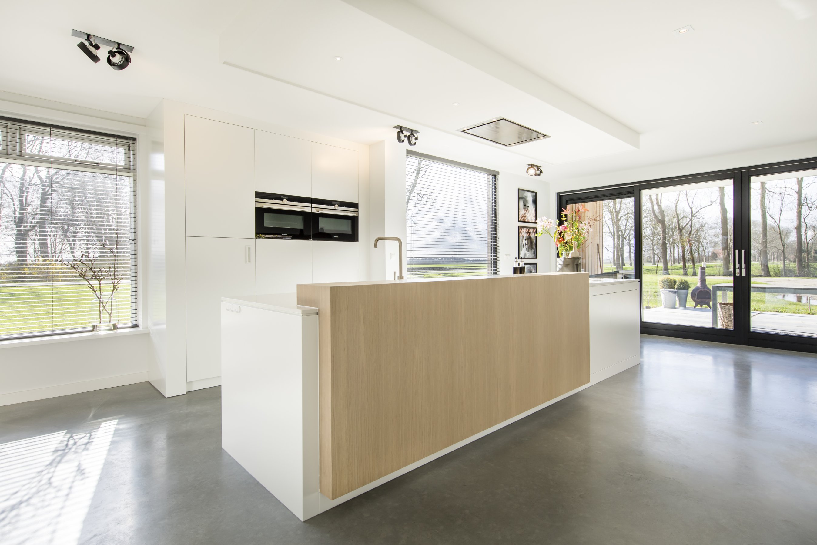 Strakke witte keuken door middel van de greeploze kasten en lades. Het eiken detail maakt de keuken helemaal af.