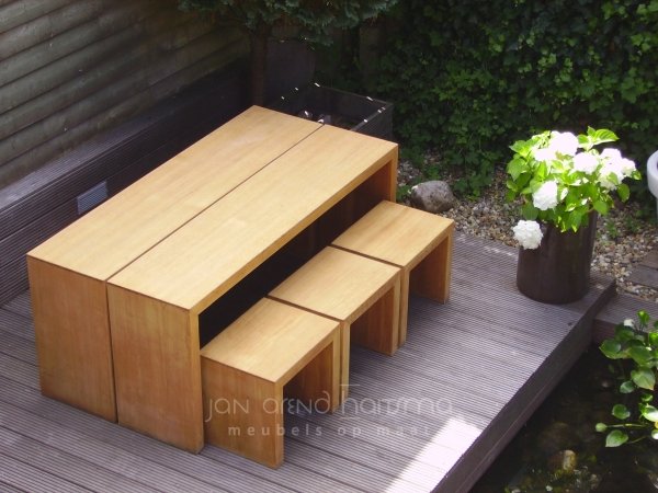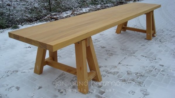 Diverse tafels die allemaal op maat gemaakt zijn, voor zowel buiten- als binnen.